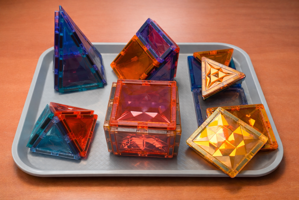 J’assemble les formes géométriques aimantées, en 2 ou 3 dimensions. Quand j’ai terminé, je défais mes constructions et je regroupe les formes géométriques par sortes.